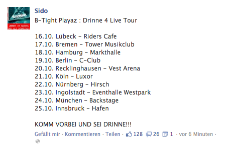 Sido hat soeben die Tour-Daten der B-Tight Playaz – „Drinne 4 Live Tour 2012“ via Facebook bekannt gegeben…