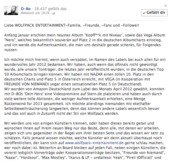 Wir werden uns von einigen Künstlern trennen, oder haben dieses bereits getan und wünschen ihnen auf ihrem neuen Weg nur das Beste, denn alle, mit denen wir arbeiten, zeigen sich uns gegenüber in der Regel von ihrer besten Seite und das wissen wir sehr zu schätzen. Falls jemand wissen möchte, welche Künstler wir denn aktuell überhaupt noch veröffentlichen, der kann sich auf www.wolfpack-entertainment.de gerne schlau machen, wer noch dabei ist. Weiterhin an Board bleiben auf jeden Fall, neben einigen Künstlern, die vorerst lediglich Vorverträge oder Kooperationsverträge besitzen, „Freunde von Niemand“, „Nazar“, „Hardsoul“, „Max Mostley“, „Ikarus & LP – undalleso: Yeah“, „Pireli (Official)“ und ….