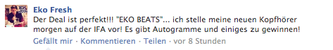„Der Deal ist perfekt!!! „EKO BEATS“… ich stelle meine neuen Kopfhörer morgen auf der IFA vor! Es gibt Autogramme und einiges zu gewinnen!“
