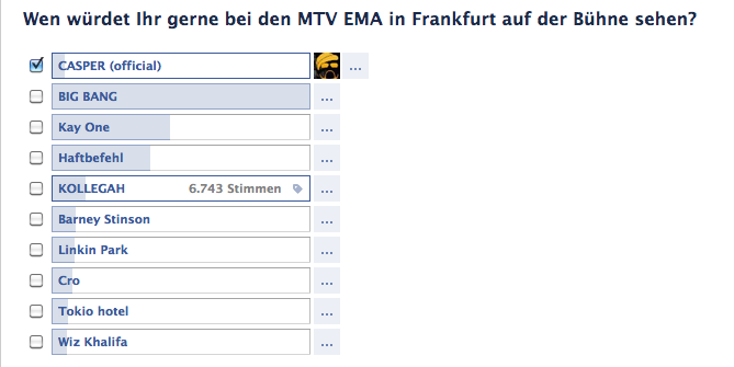 Über Facebook könnt Ihr voten… Anfangs hat es für Haftbefehl noch gut ausgesehen, mittlerweile hat sich das Voting verändert.
