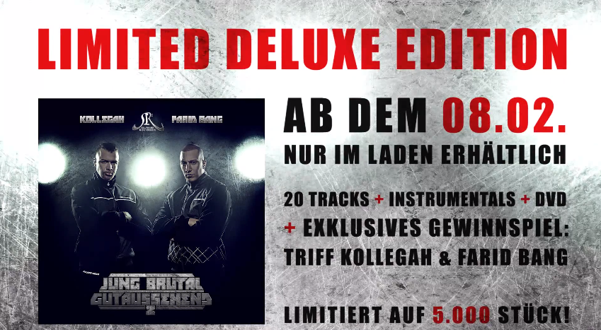 Kollegah und Farid Bang veröffentlichten den zweiten DVD-Trailer ihrer kommenden „JBG2“- DVD, welche im Rahmen und mit des neuen Album´s „Jung, Brutal & Gutaussehend 2“ (08.02.2013) veröffentlicht wird. Kollegah und Farid erzählen im Trailer ein wenig aus dem bald erscheinendem Album…