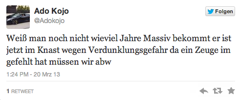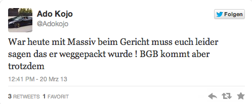 Massiv im Knast? Ja richtig! Laut dem Tweet von Ado Kojo muss Massiv für´s erste im Gefängnis bleiben. Heute morgen verkündete Massiv noch die Nachricht mit dem Gerichts-Termin an seine Fans. Nun die Nachricht von Ado Kojo der mit vor Gericht dabei war…