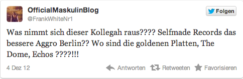 In dem Artikel (hier klicken) geht es um das Label Selfmade Records, welches angeblich das bessere Aggro Berlin sein soll. Bisher hat noch kein Aggro Berliner Stellung dazu genommen, bis auf den MaskulinBlog, der antwortete via Twitter… 😉