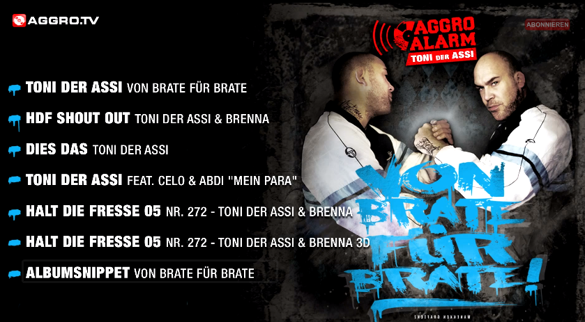 Toni der Assi veröffentlicht am 15.03.2013 sein Debüt-Album „Von Brate Für Brate„. In der kommenden Aggro Alarm Woche ist Toni der Assi aus Mannheim zu Gast und heizt die Fans schon mal mit einigen Auskopplungen, Interviews und weiteren interessanten Daten zum Album. Im folgenden Shout Out kündigt er die Aggro Alarm Woche persönlich an… Aggro…