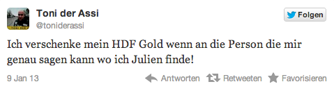 Wer kennt den Standort von Juliensblog? Und wer würde die Information an Toni der Assi weiter geben? Meint der Mannheimer Black Jacket Supporter das wirklich ernst? Via Facebook & Twitter hat er folgendes gepostet: