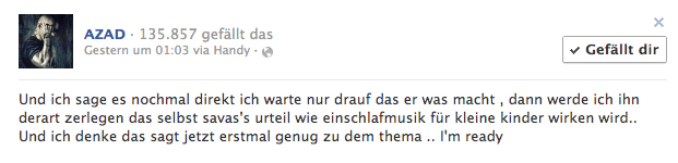 Dies zumindest von Azad´s Seite. Über Facebook hat der Frankfurter Rapper Azad als erstes gegen Kollegah (den Boss) gestichelt.